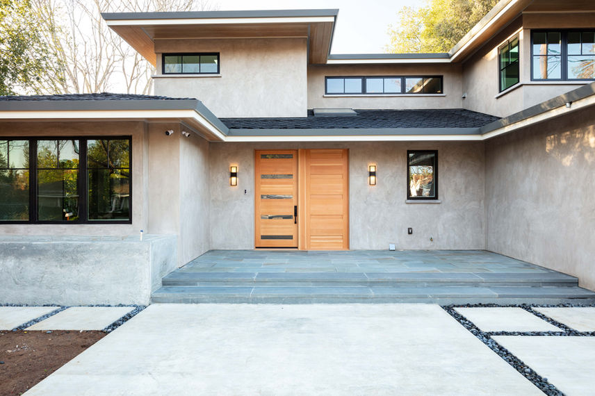This home embraces horizontal lines, open floor plans, and an emphasis on natural materials to create a harmonious and modern living environment. The house features a low-pitched roof with broad eaves for horizontal emphasis. Large windows and skylights are strategically placed to maximize natural light. These windows reflecting the emphasis on the horizontal plane. Window frames are dark in color, providing a contrast against the integral plaster walls and enhancing the overall aesthetic.