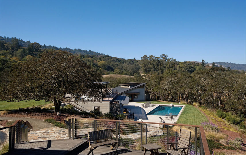 A particular focus is placed for the design of this home on blending seamlessly with the native landscape and prioritizing a connection with nature. The simple geometric forms, natural materials such as cedar siding, stone walls, walks, and patios, and emphasis on functionality coalesce into a warm and casual home for an active family. The design intentionally weaves through an existing grove of native blue oaks, creating a series of interconnected living spaces. Walls are minimized fostering a sense of unity between the different functional areas of the house. The house integrates with the natural surroundings. Large windows, glass doors, and outdoor spaces such as decks and patios blur the boundaries between indoor and outdoor living.